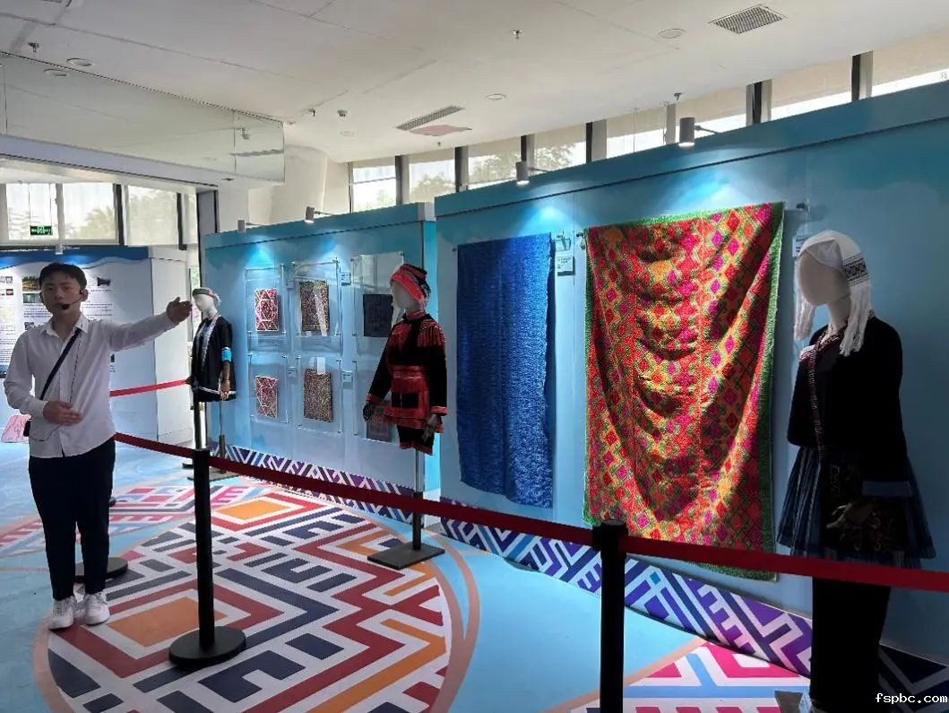 在民族文化展区,广西各少数民族的传统服饰以及独具特色的壮族织锦吸引了同学们的注意。这些展品生动地展现了广西悠久的文明历史。讲解员王皓从广西的语言文字、饮食文化、建筑文化、音乐文化、节庆文化等方面,介绍了广西丰富多彩、源远流长的灿烂文化。